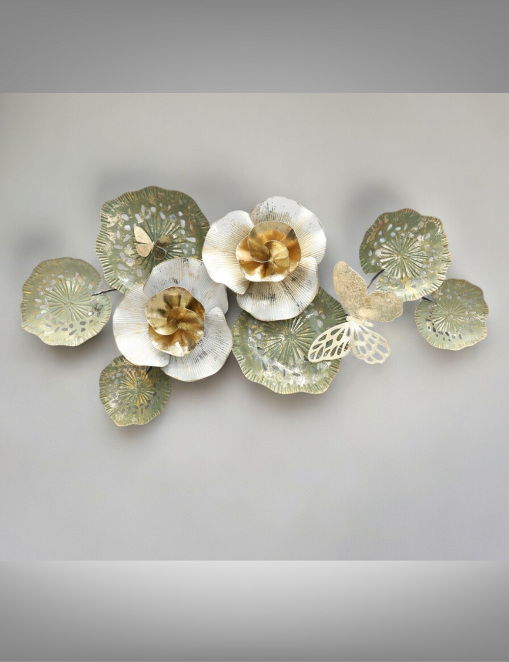 White Gold Floral with Cream Leaves Metal Panel Wall Decor 36*19 inches